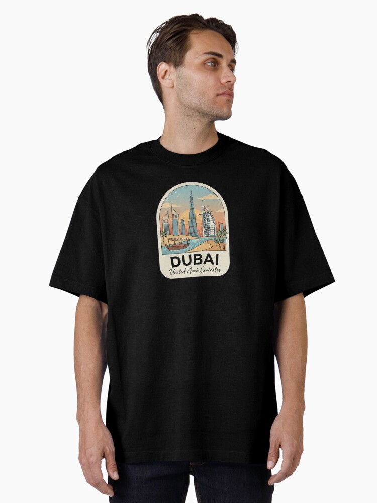 Dubai Skyline Travel Badge, United Arab Emirates Burj Khalifa and Burj Al Arab Retro Sunset Oversized T-Shirt