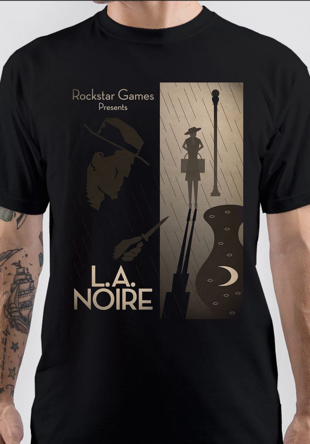L.A. Noire, L.A. Noire t-shirt, merch, Video game, action, adventure video game, Single-player video game, violent crime thriller, violent crime thriller, Rockstar Games, Team Bondi, Virtuos, Rockstar North, Rockstar Leeds, Rockstar San Diego, Rockstar New England,